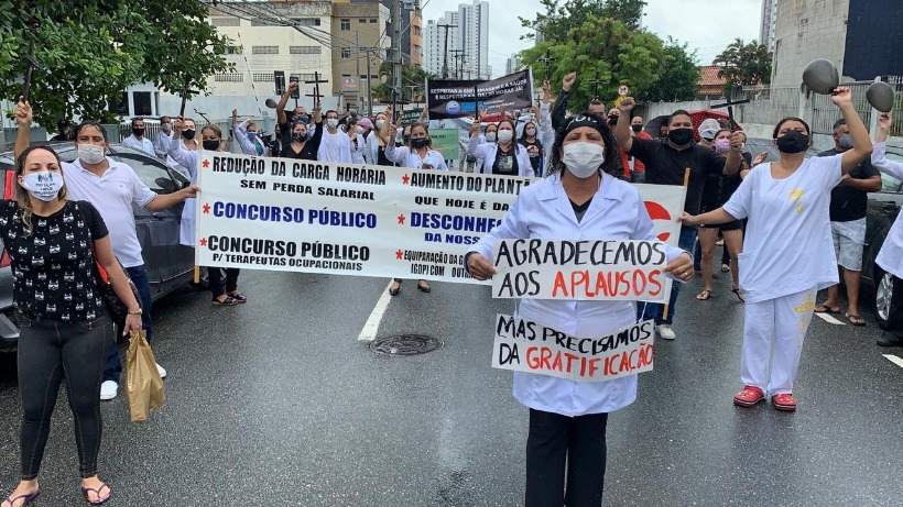 Um grupo de profissionais de saúde que atuam na linha de frente do combate ao novo coronavírus (Covid-19), em João Pessoa, realizou, na manhã desta sexta-feira (29), um protesto para pedir melhorias salariais e condições dignas de trabalho. O ato aconteceu em frente à Secretaria Municipal de Saúde. Com cartazes, faixas e empunhando cruzes, eles cobram redução de carga de trabalho sem perda salarial, realização de concurso público, além da concessão de uma gratificação extra, como a que deve ser concedida aos médicos.